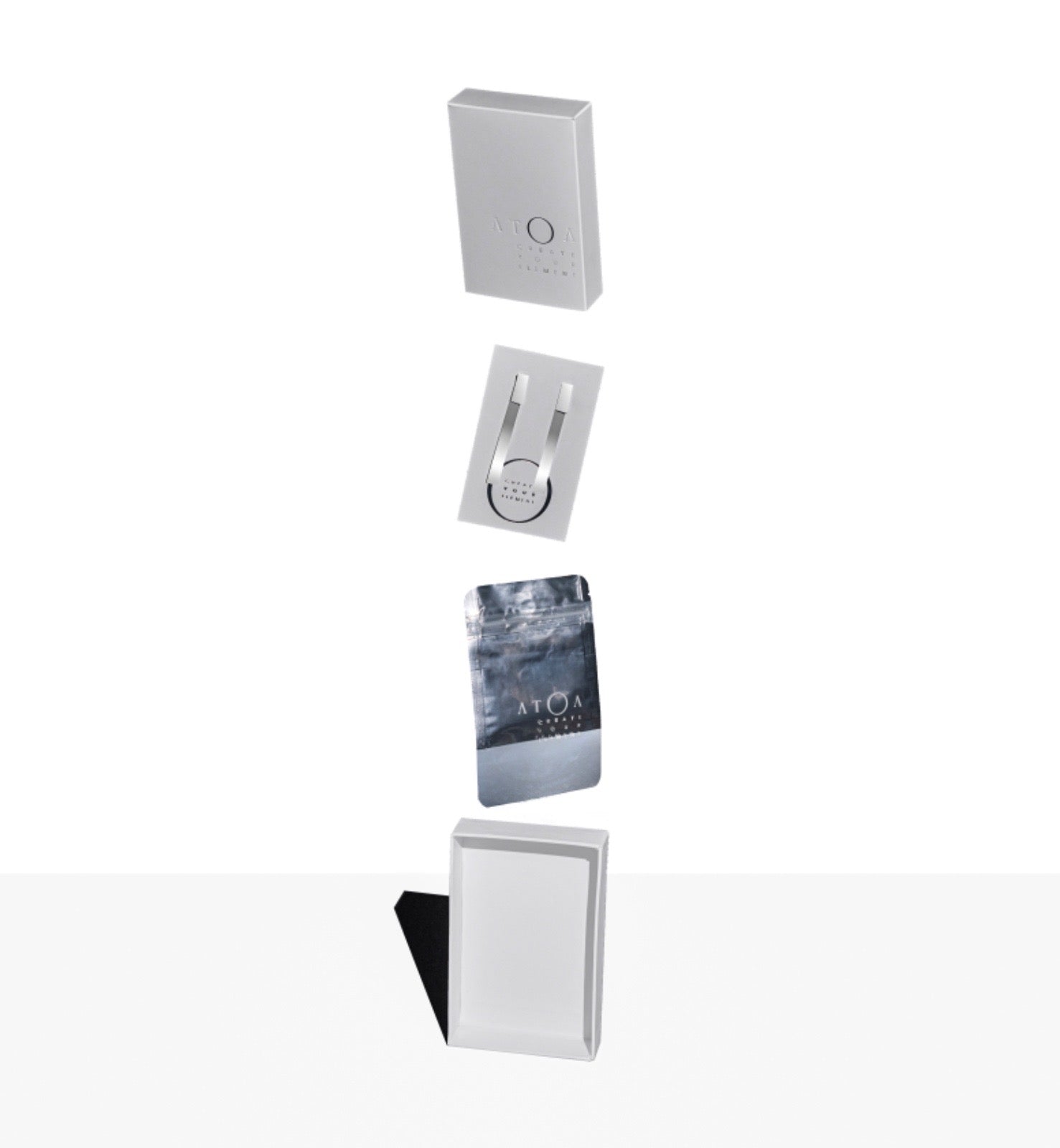 Reflecting the DNA of our brand, the Atoa Box is designed to be elegant, playful, and practical. It features an immaculate white box with our logo engraved.